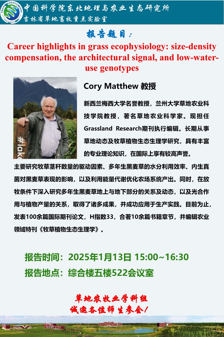 Career highlights in grass ecophysiology: size-density compensation, the architectural signal, and low-water-use genotypes-Cory Matthew 教授